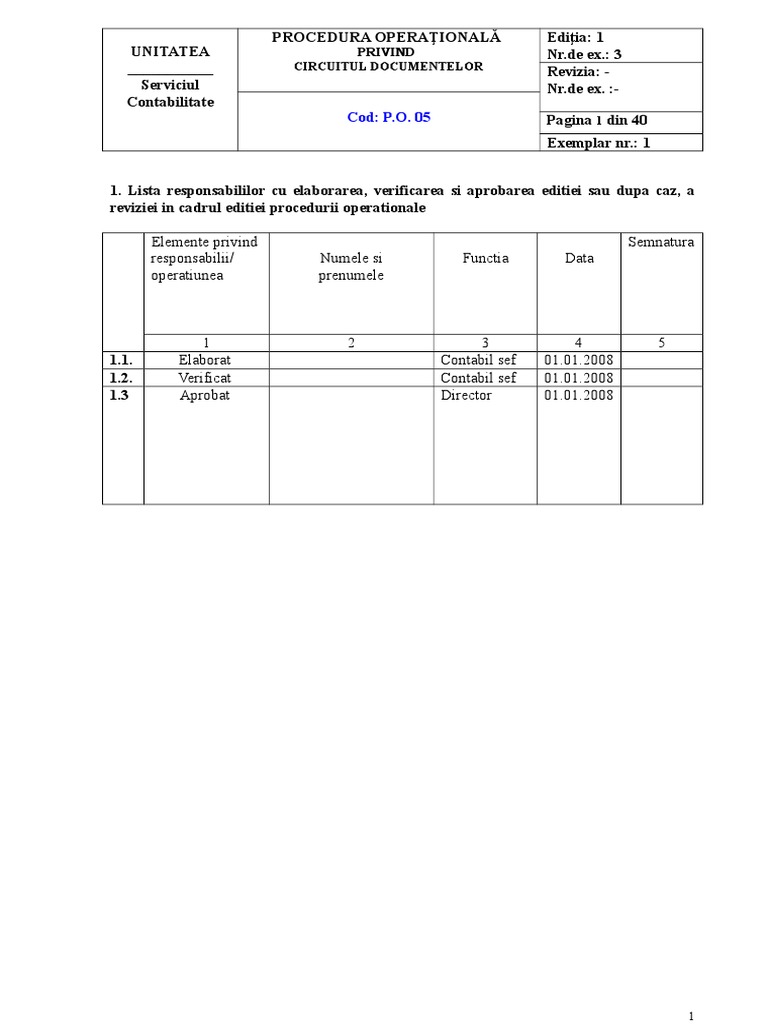 vizitati articolul complet aici : 2 Precizarea (definirea)activității la care se referă procedura operațională. Document justificativ de nregistrare n contabilitate; Procedura prin care se asigura circulatia documentelor conform cerintelor legislative.
