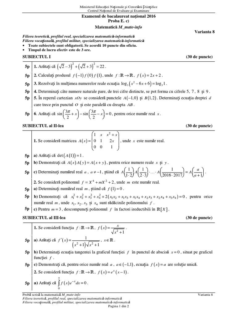 Ministerul educaţiei a pus la dispoziția absolvenților de liceu modelele de subiecte pentru examenul de bacalaureat 2019. Examenele încep la ora 09:00. Elevii au susţinut astăzi proba profilului la alegere din cele 10 discipline: